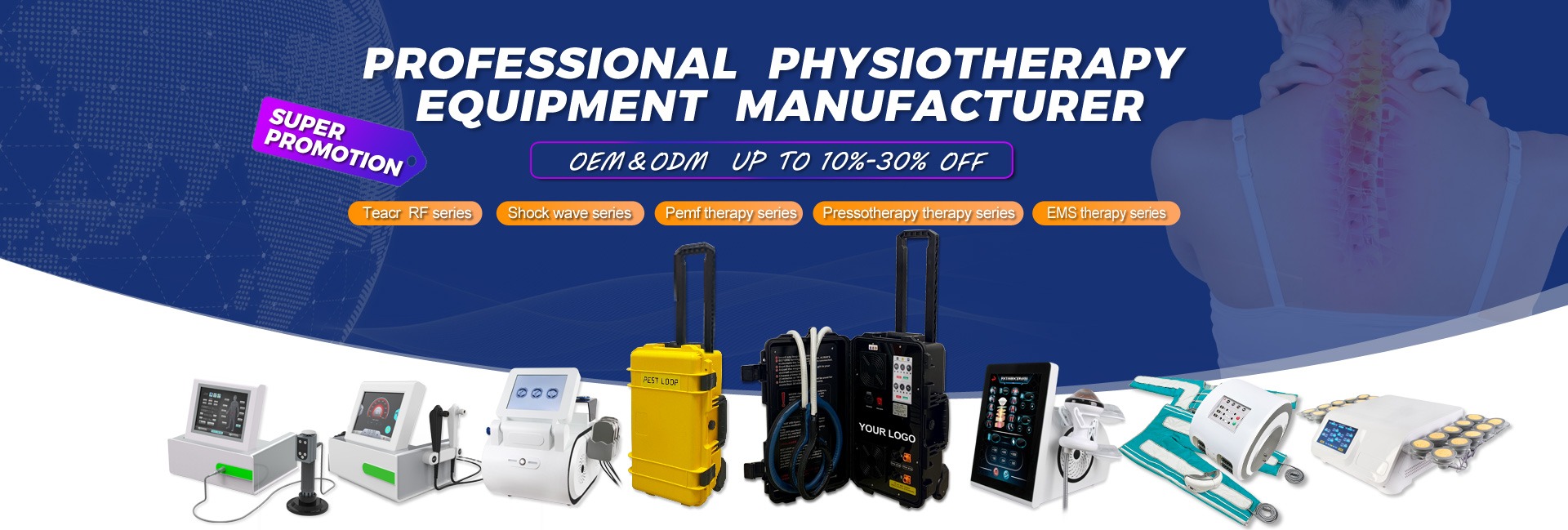 Productos principales:Máquina de fisioterapia, terapia de ondas de choque, terapia Tecar, magnetoterapia, terapia con láser